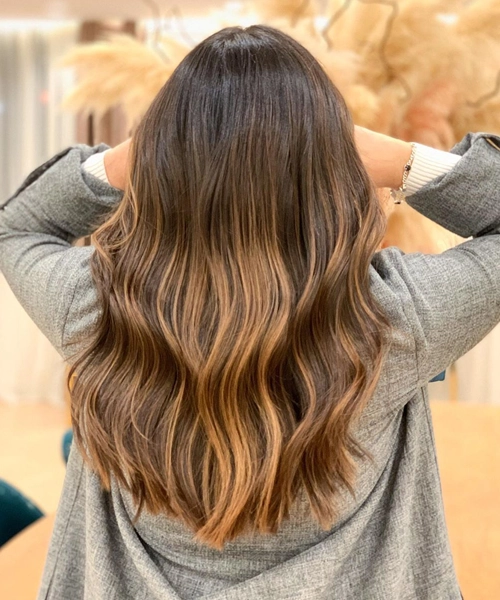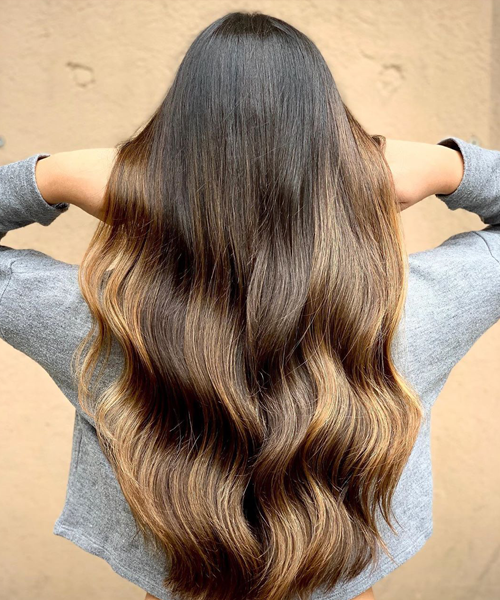 Qui a dit qu’on ne pouvait pas obtenir un beau balayage avec des nuances plus foncées ? Ces reflets noisette illuminent les cheveux foncés et leur apportent de l’harmonie.
